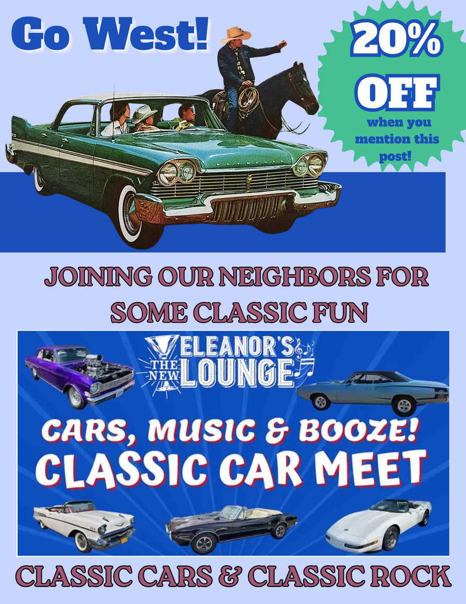Mention this post and get 20% off in Go West! during the car show on Sunday October 12